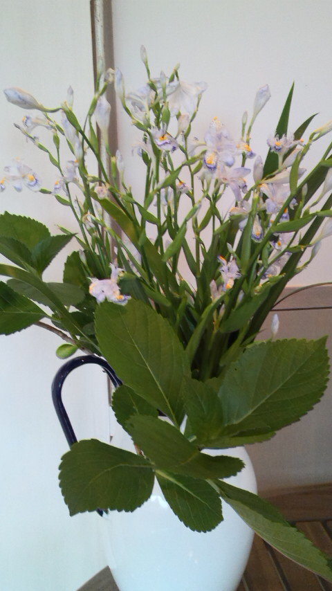 白い大きな琺瑯(ほうろう)のポットに生けてみました。